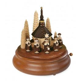Die barocke Rundkirche ist das Wahrzeichens des Spielzeugdorfes Seiffen und mit den Kurrendefiguren im Vordergrund ein beliebtes Motiv der erzgebirgischen Volkskunst. Auf diesem exklusiven, handgefertigten Klangkörper aus Sipo bewegen sich die Figuren zur Musik von "Stille Nacht". Die Gesichter der Figuren aus naturbelassenen Hölzern sind handbemalt. Die Drehung der Plattform erfolgt gegen den Uhrzeigersinn durch eine Achse, die die Laufscheibe mit dem Spielwerk verbindet und so eine Drehbewegung in Gang setzt. Durch mechanisches Aufziehen der Spieldose wird das Spielwerk aktiviert. Für den schönen Klang sorgt ein mechanisches Spielwerk aus der Schweiz, in dem handwerklich kunstvoll gestalteten Dosenkörper, der durch Konstruktion und Material die Resonanz im besonderen Maße beeinflusst.