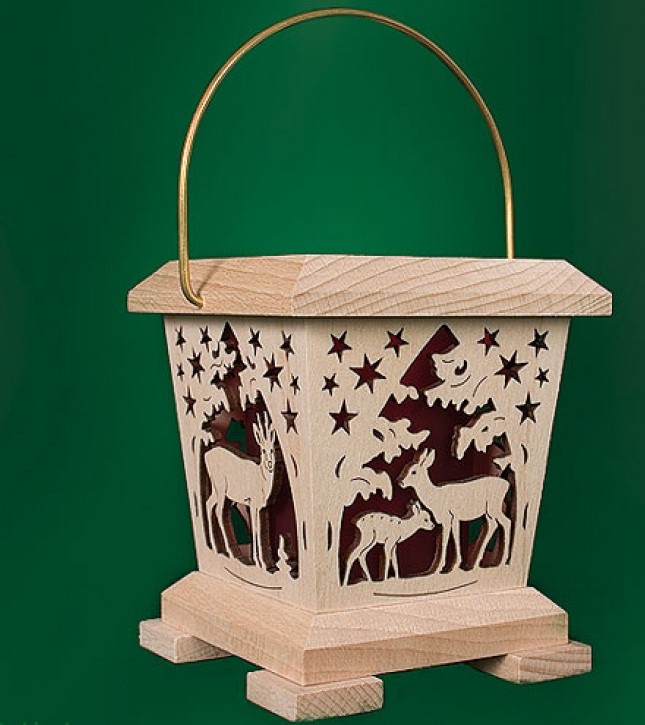 Laterne -Im Wald- für Votivkerzen oder Teelichter, Fuß und Deckel sind aus Buchenholz, die Motive sind aus 3 mm Sperrholz gefertigt, inklusive rot satiniertem Glas, Größe: (B x H x T) 8 x 9 x 9 cm, mit Henkel H = 15 cm. Verpackt in einem Geschenkkarton mit Klarsichtfenstern.