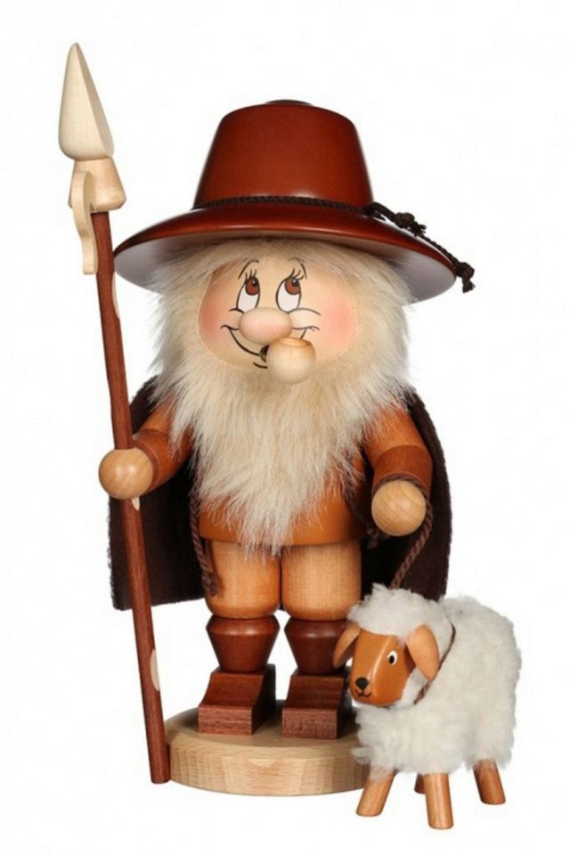 Ganz fürsorglich hat der Wichtel ein Schäfchen aus seiner Herde an der Hand. Den ganzen Tag verbringt er bei Wind und Wetter draußen, zum Glück hat er einen großen Schäferumhang und seinen Hut immer dabei.